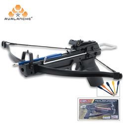 This Avalanche® mini-crossbow pistol is perfect for target practice and small-game hunting. It is constructed of impact resistant ABS with an 50-lb. draw weight, metal-limbed bow. It even has adjustable sights already installed for precision accuracy. The mini-crossbow package includes 5 plastic bolts with field tips, bowstring and target! Shoots 150 FPS up to 35 yards. 0.88 lbs